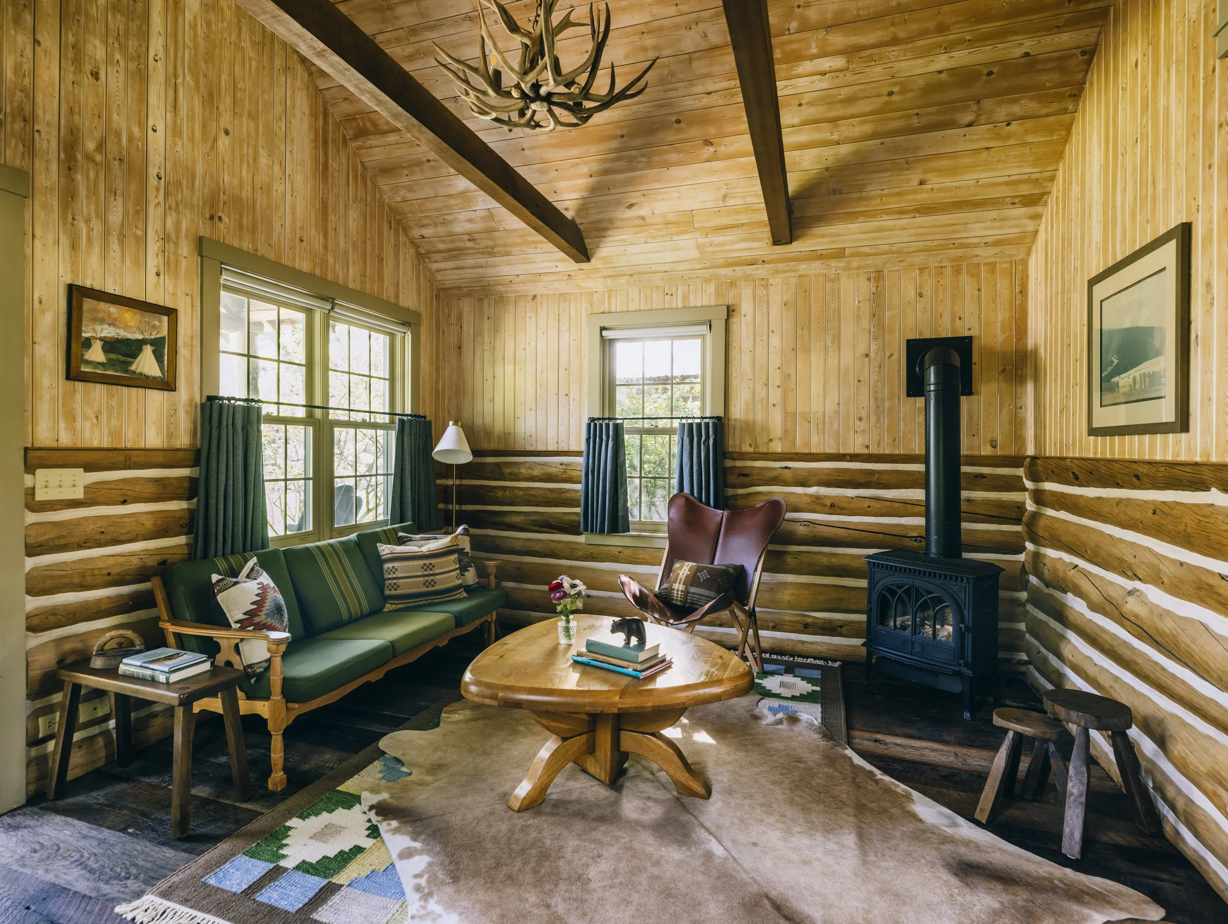 Spruce is a historic one-bedroom log cabin overlooking the main ranch meadow. Spruce is the closest accommodation to Elk Lodge for those who prioritize proximity. Enjoy a cozy queen bedroom, a romantic sitting room with stove heating, and views of Saddle Mountain from the rear porch.