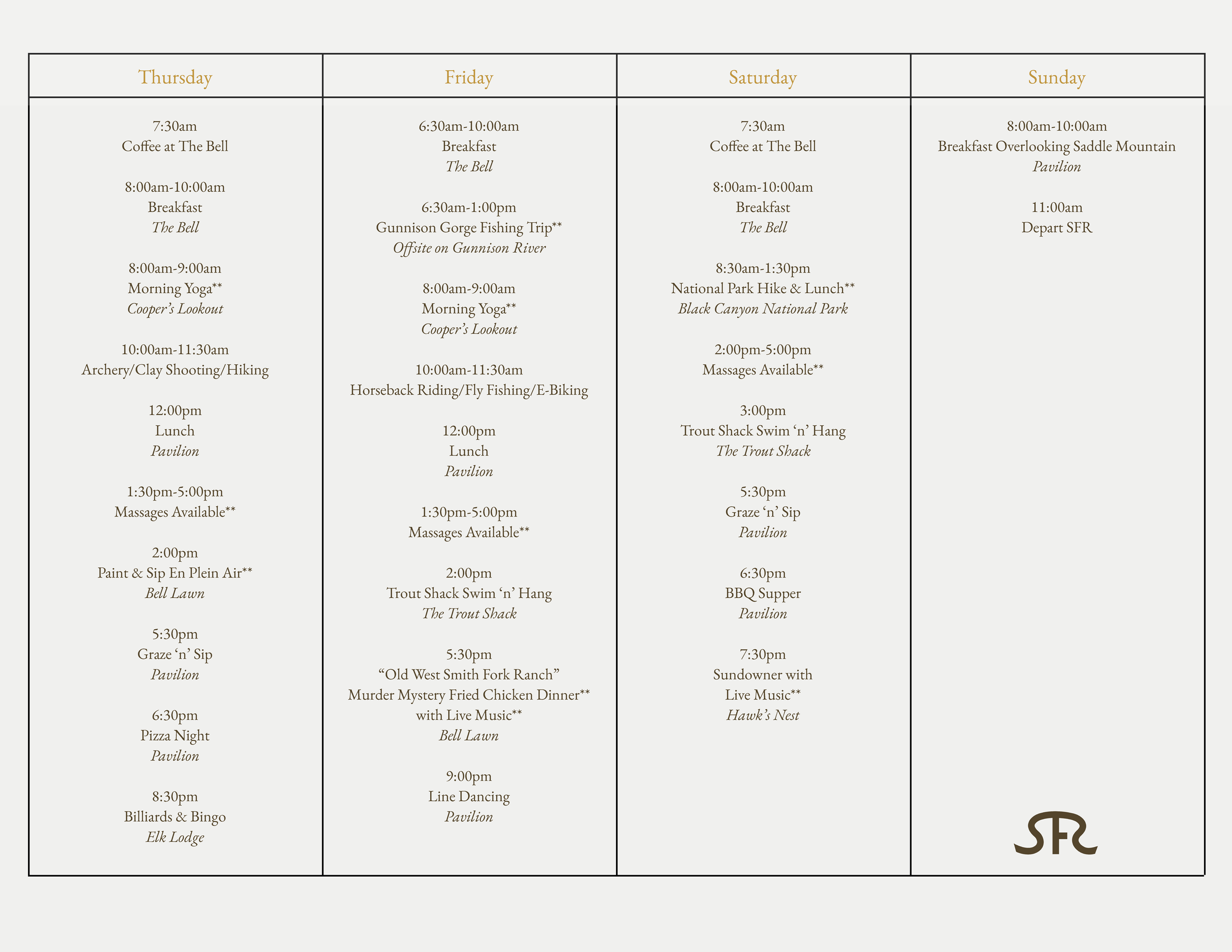 Enhance your day with yoga at Cooper’s Lookout, a stunning perch at the ranch’s highest point. Surrounded by sweeping mountain views and open sky, this peaceful setting offers the perfect backdrop for grounding breathwork and gentle movement. Whether starting your morning with intention or unwinding in the afternoon light, each class is designed to restore balance and calm.